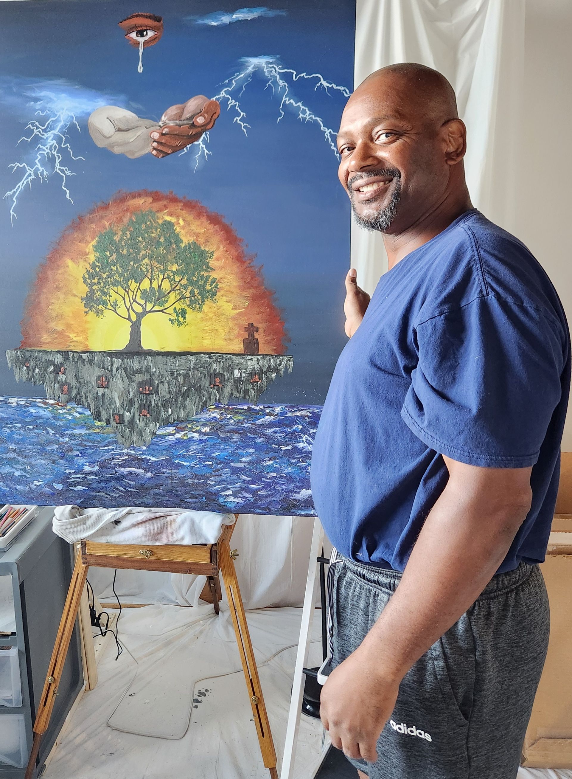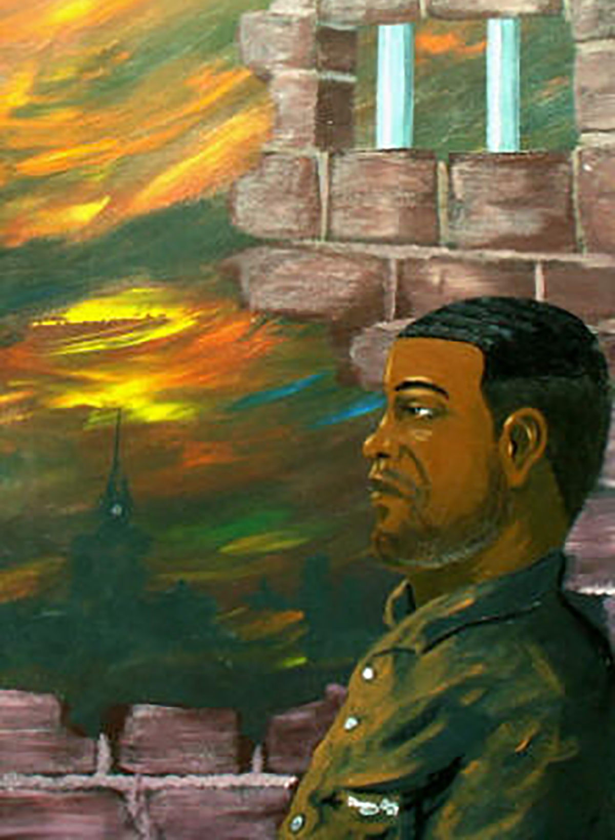 Below - Mr. Gwynn’s painting, “The Prisoner,” 2006, created when he was on death row in PA. AM Kirk, Director of Art for Justice, purchased “The Prisoner” in 2007 at Mother Mary of the Captive’s Annual Exhibit. Mr. Gwynn and AMKirk then began a consistent correspondence and collaboration which made it possible for Art for Justice to share his art and the truth of his wrongful conviction at exhibits and public events in PA and surrounding states.